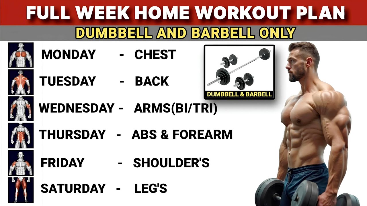 Full Week Home Workout Plan With Dumbbells & Barbell | Symmetrical Development | No Gym Required | by admin December 4, 2025 2 Check on YouTube exercise plan for a week FacebookTwitterPinterestEmail You may also like 15 Min Zumba Dance Cardio Workout for Weight... December 7, 2025 10 Minute Seniors Workout | Joe Wicks Workouts December 6, 2025 The ONLY 3 Supplements You Need For GYM... December 5, 2025 Best Way to Build Tendon Strength | Eccentrics... December 3, 2025 SUPER EFFECTIVE 6MIN 6PACK ABS WORKOUT (NO REST) December 2, 2025 90 Day Beginner Bulk Up Plan | Full... December 1, 2025 महिलाओं के लिए आसान वर्कआउट | workout exercise... November 30, 2025 NEW! 10 Minute Low Impact Seniors Workout |... November 29, 2025 CHEST WORKOUT & NATURAL TESTA BOOSTER FOR BEGINNERS... November 28, 2025 Ultimate Weekly Workout Plan for 50+ (Backed by... November 27, 2025